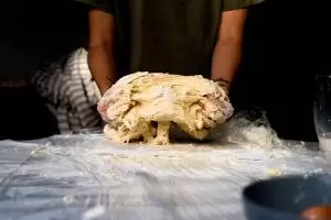 4) La pâte doit être travaillée avec énergie pendant 10 minutes, en la fouettant sur la planche à pâtisserie, pour que la pâte devienne élastique.